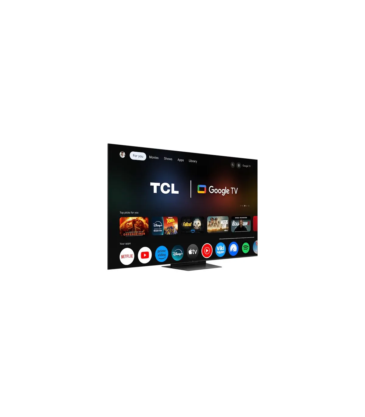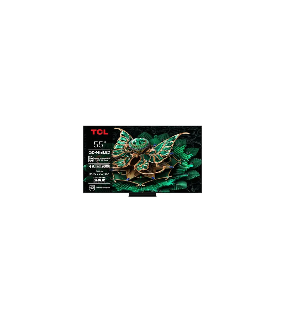Le TCL 55C7K impose par ses 55 pouces (~ 140 cm), tout en restant remarquablement fin grâce à sa conception Mini-LED avancée. Son châssis noir sobre et son cadre étroit orientent clairement l’attention vers l’image. Le pied central offre une bonne stabilité sur meuble, et la compatibilité VESA (300 × 300 mm) permet une installation murale précise et élégante. Le modèle combine matériau haut de gamme et design moderne pour s’intégrer aussi bien dans un salon contemporain que dans une pièce multimédia dédiée.