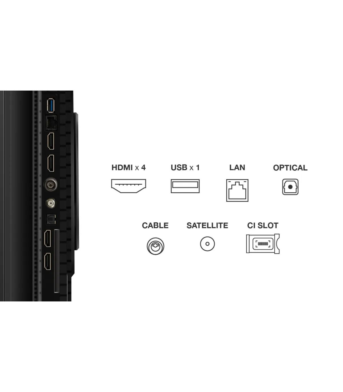 L’interface Smart TV repose sur Google TV, offrant un accès direct aux services de streaming, une commande vocale intégrée et une navigation fluide. La connectique comprend quatre ports HDMI, plusieurs ports USB, une entrée Ethernet, une sortie audio optique et un slot CI+ pour réception numérique. Le Wi‑Fi double‑bande et le Bluetooth 5.x permettent de connecter périphériques et accessoires sans fil.