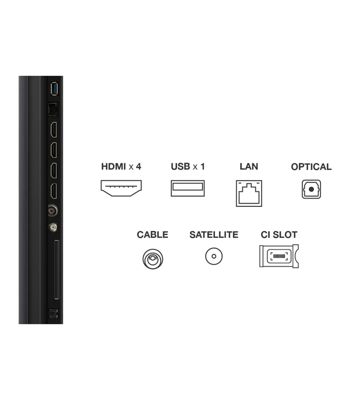 La connectique est complète pour un usage polyvalent: quatre entrées HDMI dont deux HDMI 2.1 pour 4K120, eARC sur une des prises, ports USB pour médias, entrée antenne TNT/câble, port CI+, sortie audio numérique optique et connecteur Ethernet RJ45. Cette richesse facilite la connexion simultanée de consoles, lecteur UHD et système audio externe.