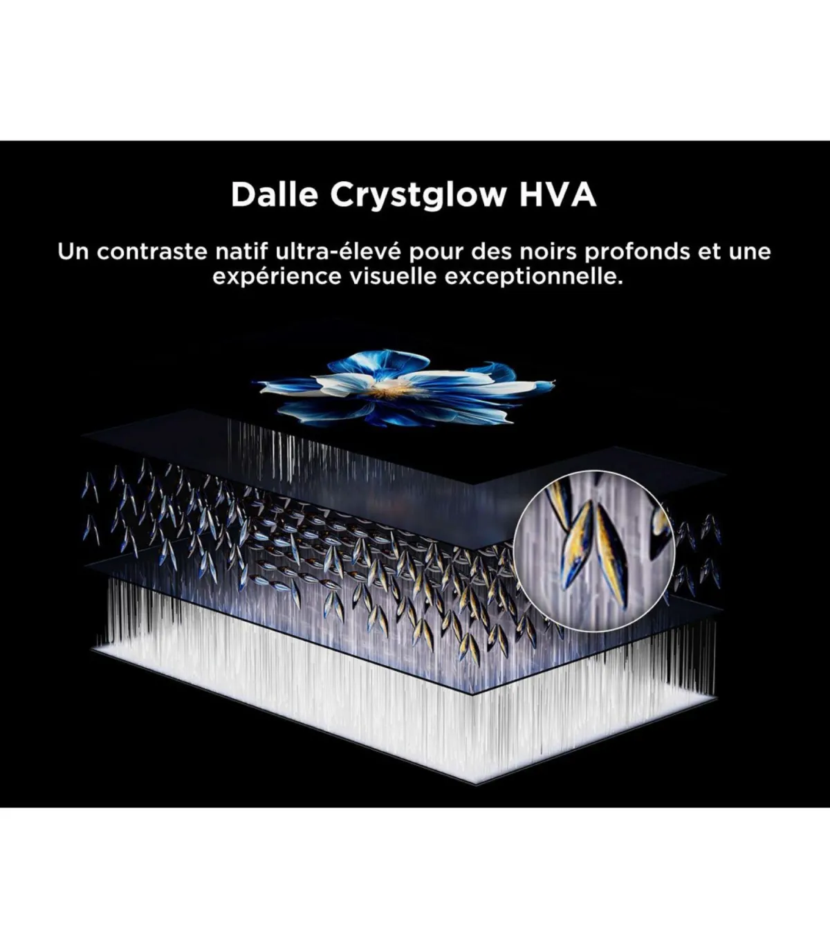 Le 65C7K utilise une dalle LCD VA 65" 4K UHD (3840 x 2160) de type QD MiniLED avec rétroéclairage à zones pour un contraste profond et des noirs maîtrisés. La technologie Quantum Dot élargit l’espace colorimétrique et garantit des teintes saturées mais justes, tandis que le contrôle fin du rétroéclairage améliore la lisibilité des scènes sombres et la dynamique sur les pics lumineux. La définition 4K révèle un niveau de détail élevé, idéal pour les films HDR, le streaming UHD et les jeux nouvelle génération.