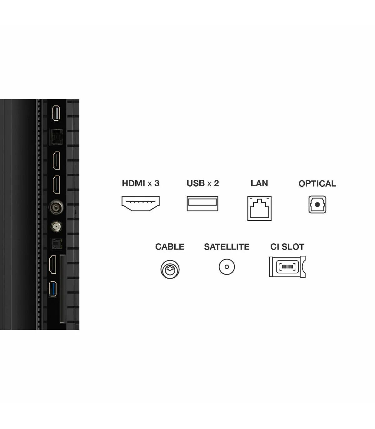 La connectique met à disposition plusieurs HDMI dont 1 entrée HDMI eARC pour l’audio haute définition vers un ampli ou une barre de son, des ports USB pour la lecture de médias, une sortie audio optique, une prise casque, une entrée antenne et un port Ethernet. Les tuners numériques assurent la réception des chaînes en DVB-T/T2/C/S2 selon disponibilité.