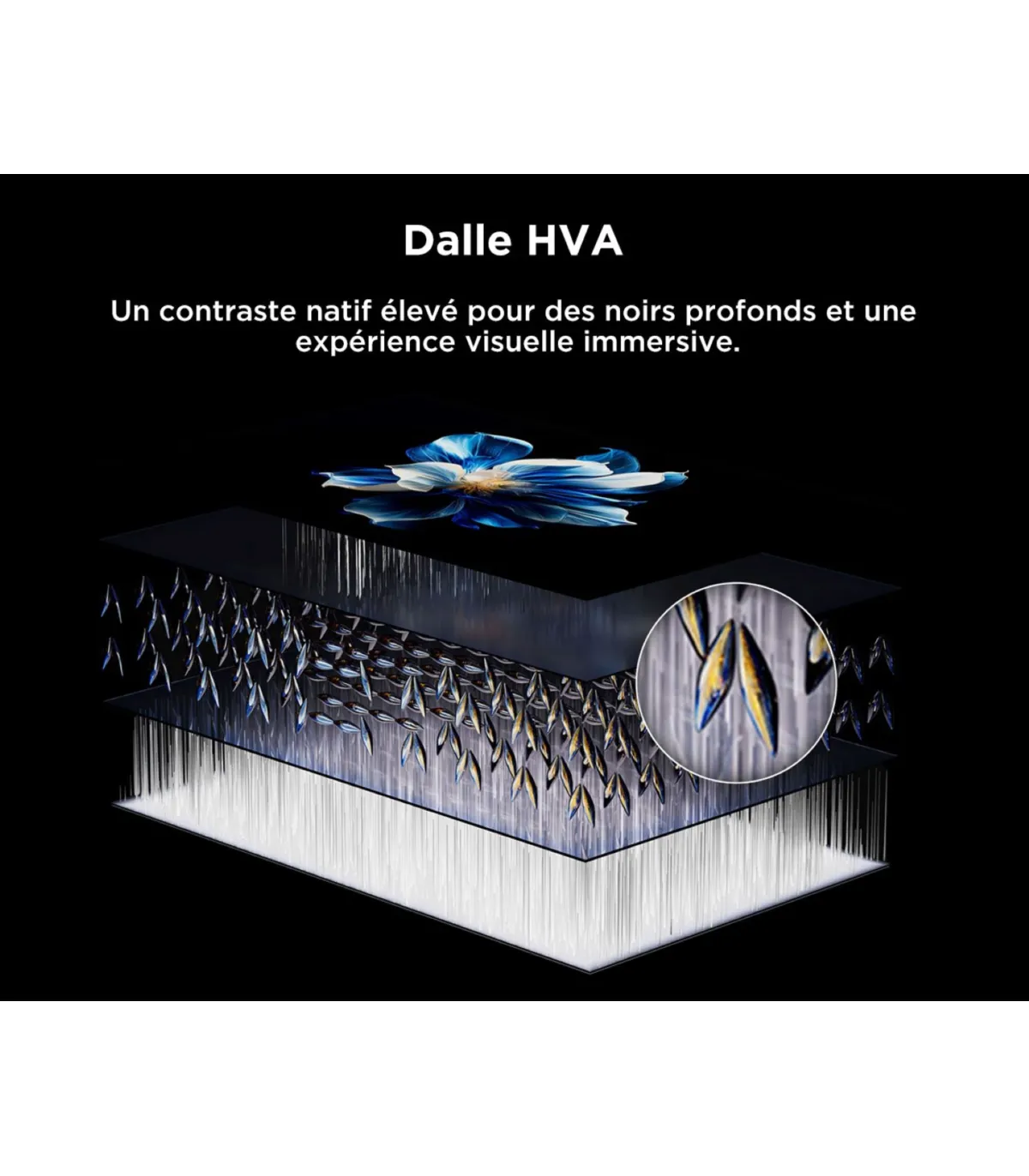 La dalle 4K UHD (3840 x 2160) offre une clarté remarquable et des couleurs denses grâce à la technologie Quantum Dot. Le rétroéclairage à contrôle fin assure des noirs profonds, un contraste enrichi et une homogénéité lumineuse stable sur cette diagonale XXL. La calibration usine met en valeur les teintes de peau et les nuances sombres des scènes cinéma, tout en conservant une dynamique lumineuse adaptée aux salons lumineux.