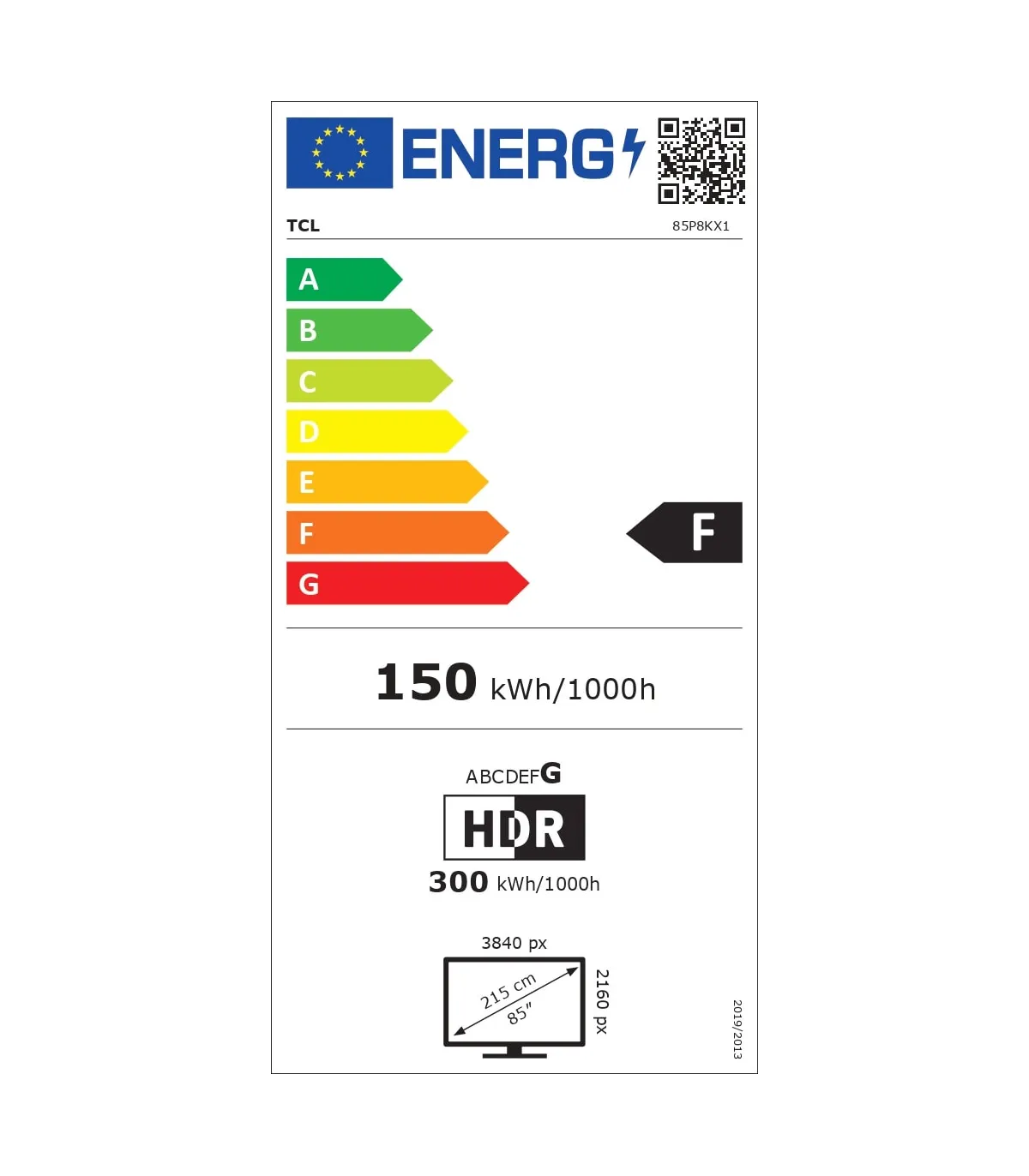 Optimisé pour une grande diagonale, le modèle affiche une classe énergétique F conforme aux dernières exigences d’efficacité, avec des modes éco et une gestion intelligente du rétroéclairage pour réduire la consommation sans dégrader la qualité d’image.