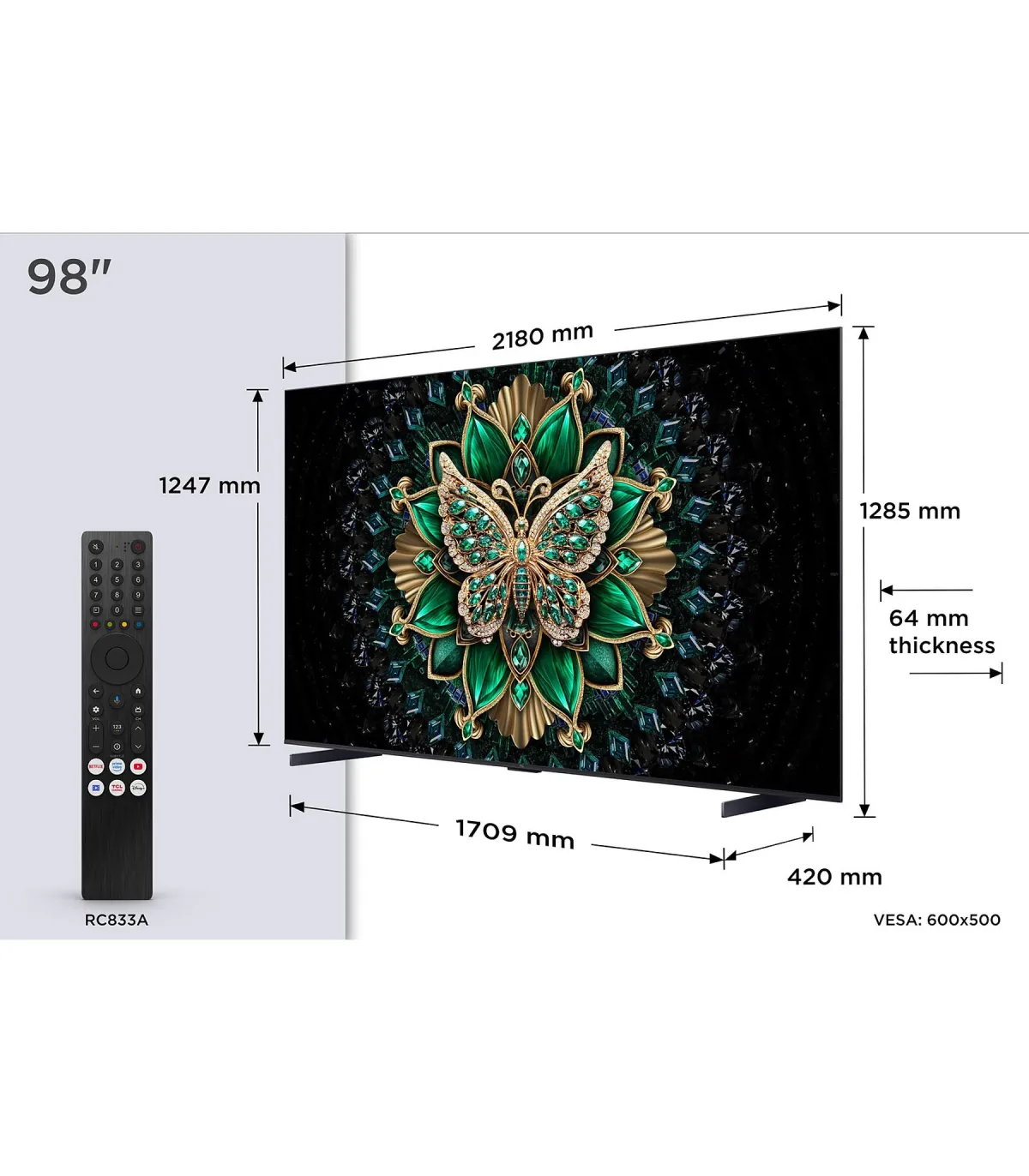 Découvrez le téléviseur TCL 98C6K et transformez votre salon en salle de cinéma grâce à son immense écran 98" en 4K UHD et sa technologie QD MiniLED offrant des noirs profonds, un contraste précis et des couleurs éclatantes. Profitez d’une image ultra réaliste avec les formats HDR10+/Dolby Vision et d’une fluidité exceptionnelle grâce au taux de rafraîchissement 120 Hz (idéal pour films d’action, sport et jeux). Son système Smart TV Google TV vous donne accès rapidement à vos applications préférées, avec commande vocale intégrée. Côté connectivité, bénéficiez de HDMI 2.1, Wi‑Fi et Bluetooth pour brancher consoles, barres de son et appareils mobiles en toute simplicité. Le design borderless moderne s’intègre parfaitement à tout intérieur, tandis que l’upscaling 4K et le traitement d’image avancé optimisent chaque contenu. Avec un son immersif compatible Dolby Atmos, ce téléviseur haut de gamme offre une expérience cinéma à domicile complète, prête pour le gaming nouvelle génération et le streaming en 4K. Optez pour une qualité d’image spectaculaire et une utilisation intuitive au quotidien.