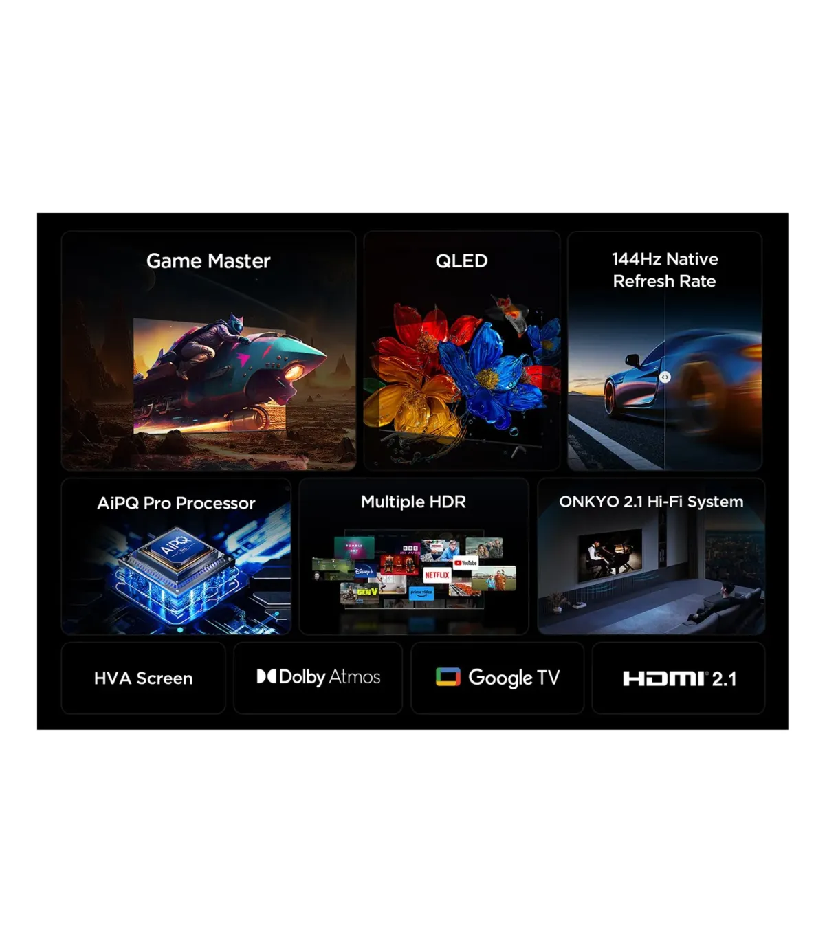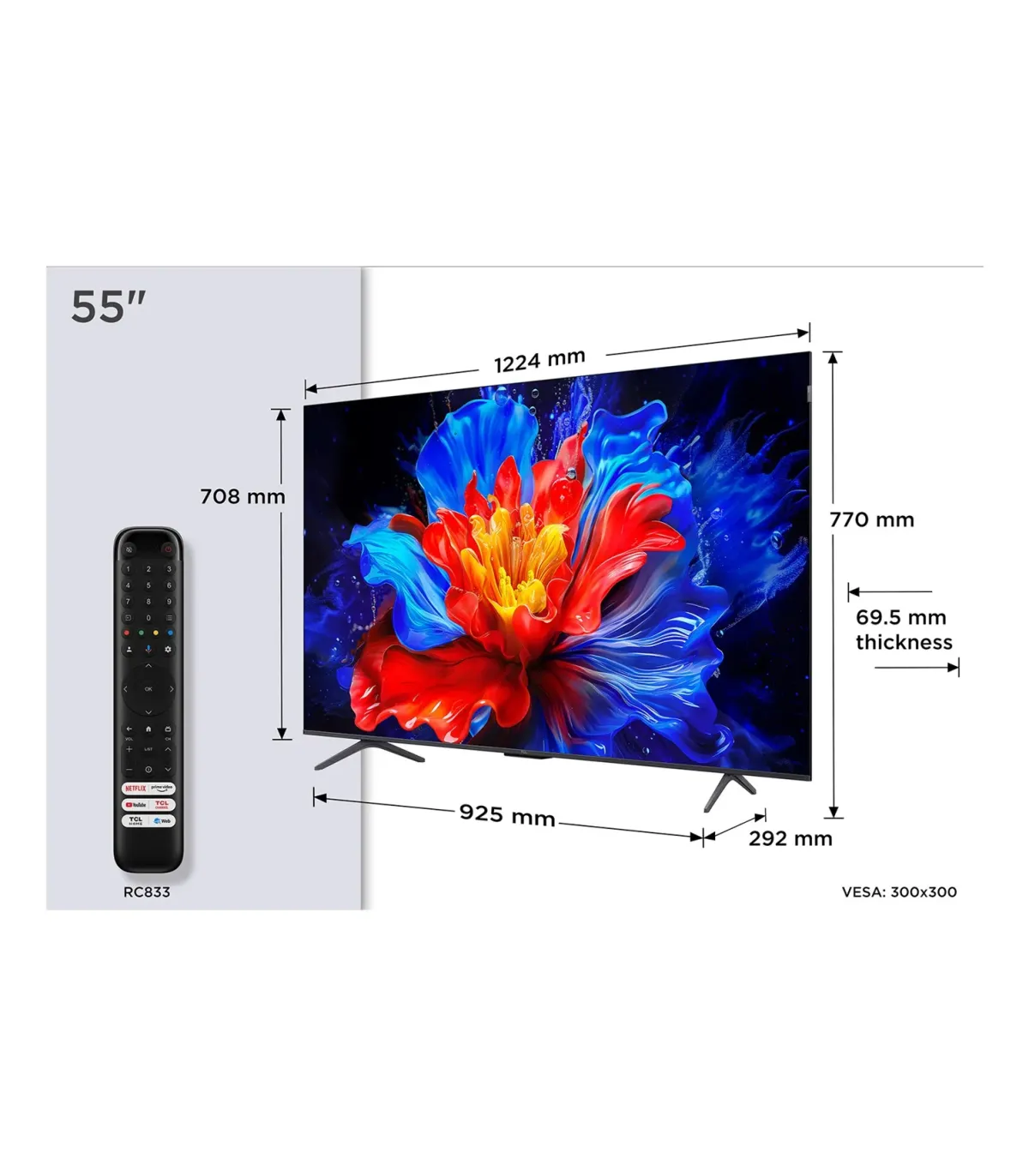 Découvrez le TCL P8K 55P8K, un téléviseur QLED 55" 4K Ultra HD pensé pour l’image, le son et le jeu. Sa dalle 10 bits et la technologie Quantum Dot offrent des couleurs DCI-P3 éclatantes, portées par le TCL AiPQ Pro Processor pour un upscaling 4K précis. Compatible Dolby Vision, HDR10/10+ et HLG, il atteint 350 nits pour des contrastes percutants. Les gamers profitent d’un taux natif 120 Hz, du 240Hz Game Accelerator, VRR, ALLM et AMD FreeSync pour une fluidité exemplaire. Le son Onkyo 2.1 avec subwoofer 15 W (35 W RMS) et Dolby Atmos/DTS Virtual:X garantit une immersion totale. Animé par Google TV (Android 12), il intègre Chromecast, Miracast, AirPlay 2, Assistant Google et Alexa, avec Wi‑Fi 5, Bluetooth 5.2, eARC et 4x HDMI 2.1. Design sans châssis, finition métallique et VESA 300x300 pour une installation élégante. Dimensions sans pied: 1224 x 708 x 70 mm; poids 11 kg. Efficacité énergétique: SDR F / HDR G. QLED 4K 120 Hz, Dolby Vision/Atmos, AiPQ Pro, VRR/ALLM/FreeSync, Google TV + Chromecast/AirPlay 2, 4x HDMI 2.1 eARC, Onkyo 2.1 avec subwoofer, Wi‑Fi 5 & Bluetooth 5.2, Design sans châssis métallique.