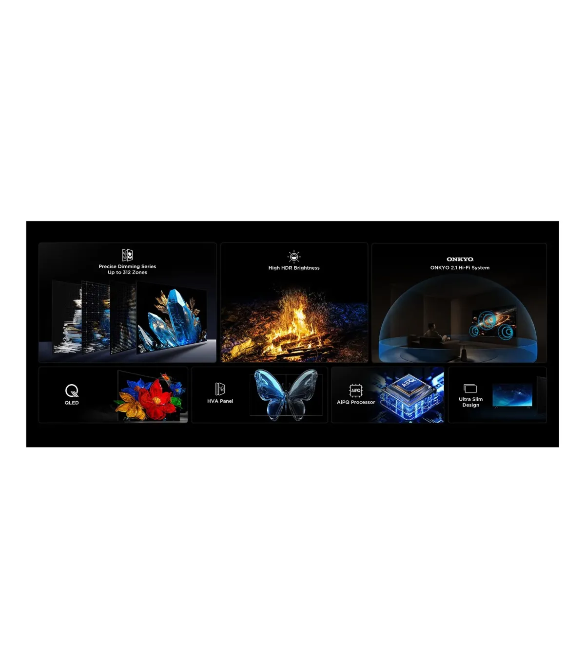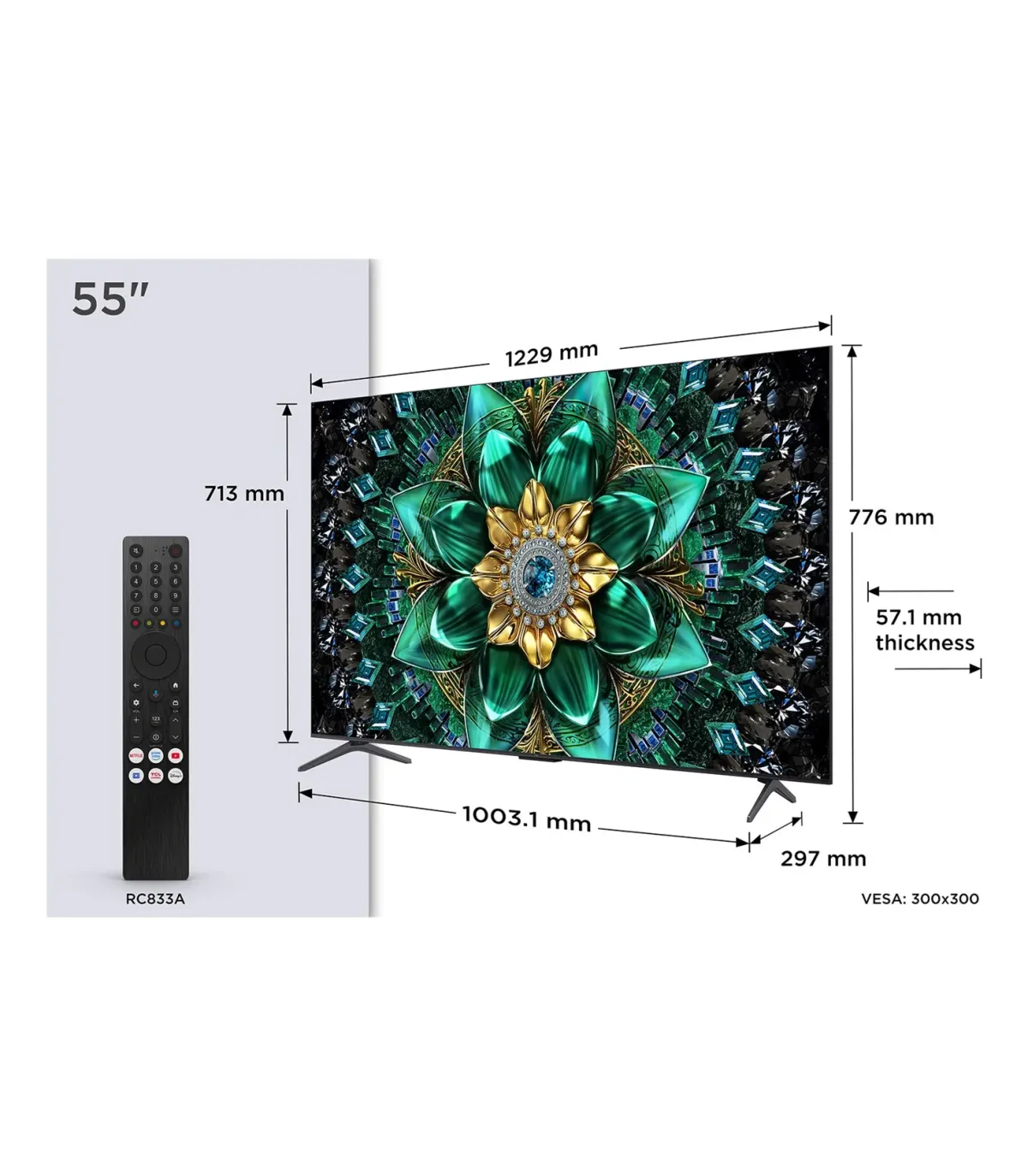 Découvrez le TCL Q6C 55Q6C, un téléviseur 55" 4K Ultra HD QD‑Mini LED au design métallique sans châssis, taillé pour l’image et le divertissement. Grâce au processeur TCL AiPQ Pro, au Quantum Dot, au Dolby Vision IQ, HDR10+ et HLG, profitez de couleurs riches, d’un contraste “Mega” et d’une mise à l’échelle 4K précise. Les joueurs bénéficient du 240Hz Game Accelerator, du VRR et de l’ALLM pour une réactivité optimale. Côté audio, le système 2.1 canaux 40 W avec subwoofer intégré 20 W, Dolby Atmos et DTS Virtual:X offre un son ample et immersif. Smart TV sous Google TV (Android 12) avec Chromecast intégré, Apple AirPlay 2, T‑Cast, Alexa et Google Assistant compatibles, plus les apps majeures (Netflix, Prime Video, YouTube, Apple TV). Connectivité complète: 4x HDMI 2.1 (eARC/ARC, QMS), Wi‑Fi 5, Bluetooth, LAN, USB 3.2, optique, CI+ 1.4, VESA 300x300. Dimensions (avec pied): 1229 × 776 × 297 mm. Classe énergie F (SDR) / G (HDR), veille 0,5 W. Garantie 2 ans.