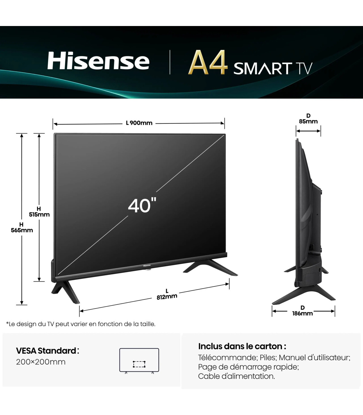 En résumé, le téléviseur Hisense 40A4Q combine parfaitement design moderne, qualité visuelle exceptionnelle et son immersif avec une grande variété d'options de connectivité pour offrir aux utilisateurs l'expérience audiovisuelle ultime.