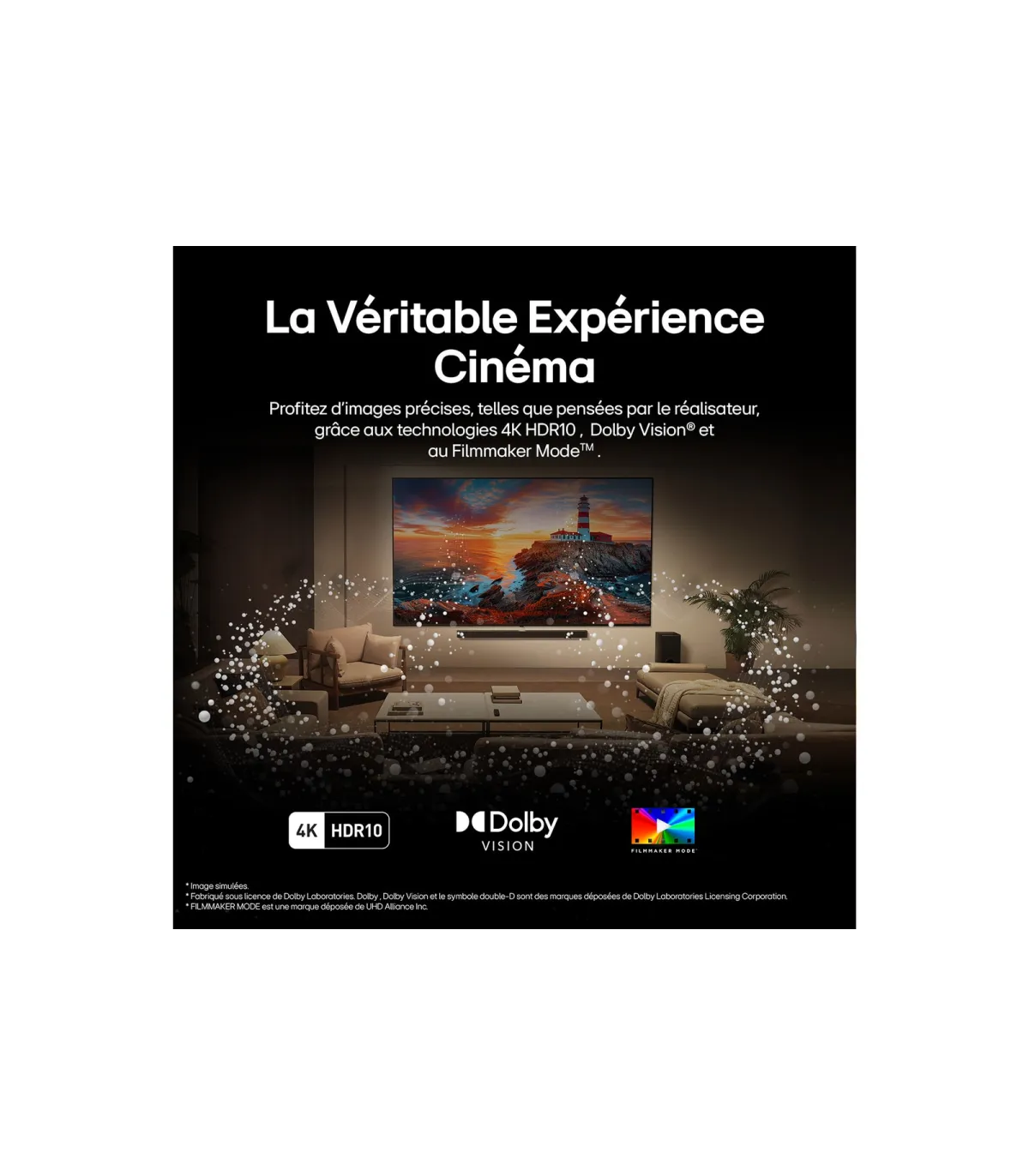 L’audio embarqué délivre jusqu’à 40 W avec une configuration 2.2 canaux : deux haut-parleurs principaux et deux subwoofers intégrés. Le traitement AI Sound Pro (Virtual 9.1.2) simule une scène sonore large et immersive, et l’AI Acoustic Tuning ajuste le rendu en fonction de votre pièce. Le téléviseur est compatible Dolby Atmos, offrant une spatialisation multidimensionnelle renforcée lors de films ou de jeux.