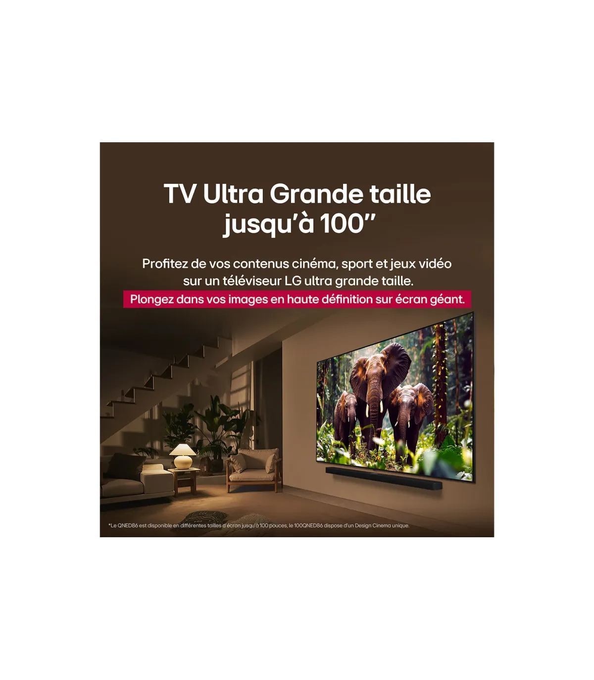 Le LG 100QNED86A6 est un téléviseur Ultra Big TV exceptionnel : dalle Mini-LED QNED evo 4K, couleurs dynamiques, performance IA, gaming haute fréquence, son immersif et interface webOS moderne. Il transforme un espace de vie en véritable salle de cinéma ou en centre de divertissement grand format, offrant une expérience visuelle et sonore premium, parfaitement adaptée aux amateurs d’image et de technologie.